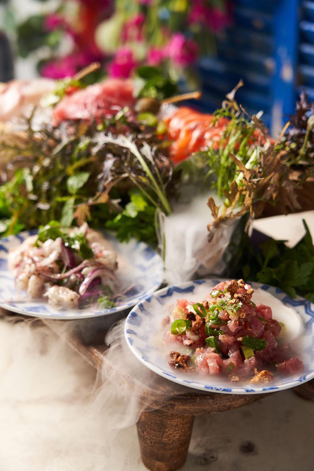 וממשיכים, צזיקי עם שמן זית, אורגנו מטוגן וסלילי מלפפון, פלפלים אדומים ומתוקים קלויים בגריל, אורגנו מטוגן וגבינת פטה , גם היא כמובן הישר מיוון. איקרא חלומית ומטריפה עם בצל ירוק ושמן זית מלטף, פרוסות חציל בתחמיץ יווני, אגוזים מקורמלים ושום קונפי, חציל יווני שרוף על פחמים יחד עם בצל ירוק וגבינת פטה, הערינג שמאלץ בצל ירוק וצ'ילי. כן, כן. הערינג יש בעוד מקומות חוץ מהולנד. ועוד עוד וזה רק ההתחלה.